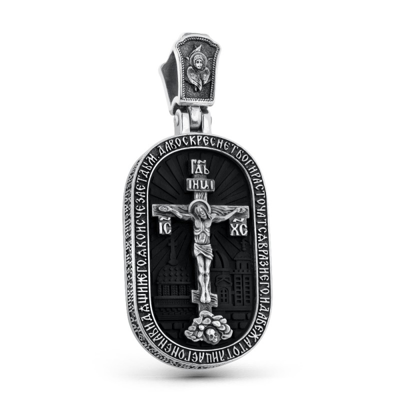 Распятие Спасителя выполнено из серебра и помещено в изящный овальный серебряный медальон, который формирует цельную и выразительную композицию.