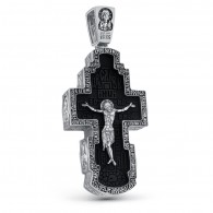 Крест изготовлен из благородного дерева эбен с глубокой тёмной фактурой и заключён в серебряный оклад. На лицевой стороне размещена серебряная фигура Спасителя, переданная в традиционной иконографии Распятия.