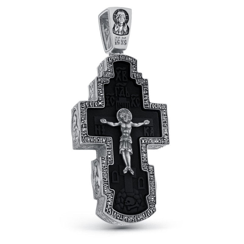 Крест выполнен из благородного дерева эбен, известного своей высокой плотностью, глубокой тёмной фактурой и долговечностью. Основа заключена в изящный серебряный оклад. На лицевой стороне размещена серебряная фигура Спасителя, выполненная в традиционной иконографии Распятия.