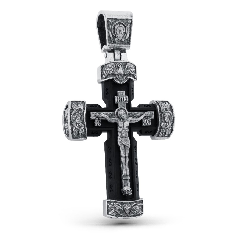 Крест выполнен из прочного полимерного материала с фактурой под дерево и дополнен серебряными элементами. В центре размещено Распятие Спасителя из серебра, подчёркивающее торжественность и значимость образа.