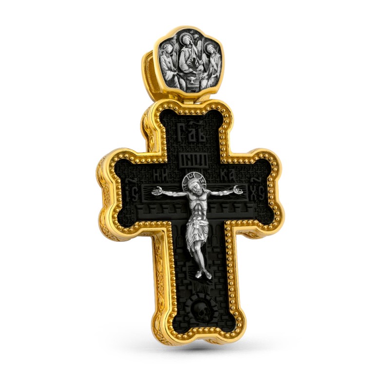 Крест выполнен из прочного полимерного материала с благородной фактурой и украшен серебряным образом Распятия Спасителя. На поверхности основы аккуратно выгравированы элементы традиционной иконографии: стены Иерусалима, голова Адама, надписи НИКА и IC XC.