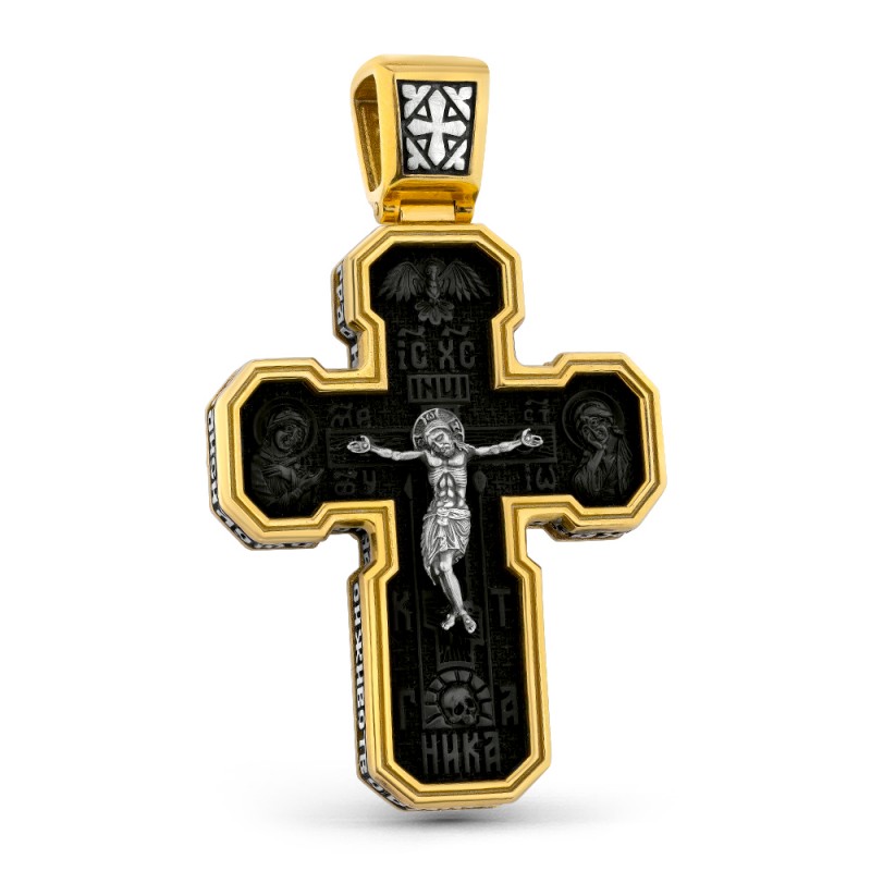 Крест выполнен из прочного полимерного материала с благородной фактурой и украшен серебряным Распятием Спасителя. В центральной части креста, по сторонам от Христа, размещены образы Богородицы и Иоанна Крестителя — традиционные свидетели Голгофской сцены.