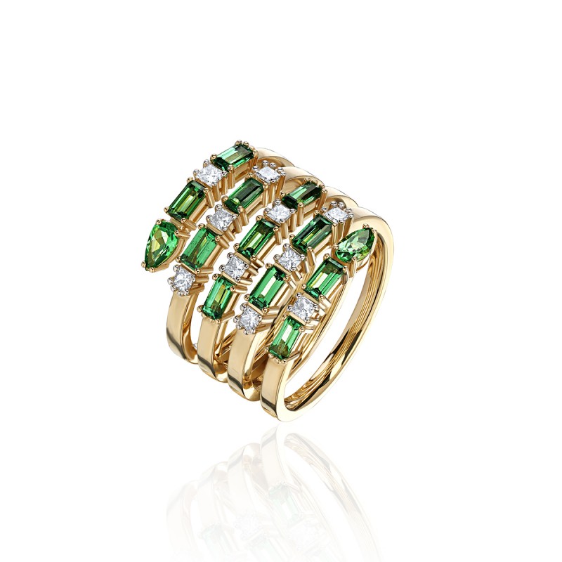 Кольцо с бриллиантом и тсаворитом из желтого золота 750 пробы можно купить в нашем интернет-магазине с доставкой по Москве, а также транспортными компаниями по всем городам России.
