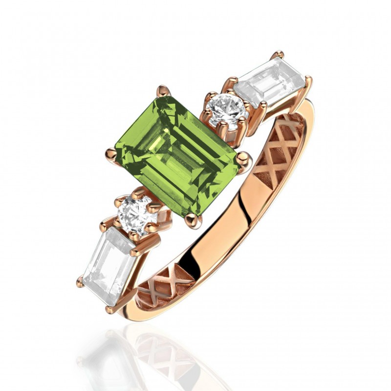 Кольцо с фианитом, хризолитом и фианитом из красного золота 585 пробы можно купить в нашем интернет-магазине с доставкой по Москве, а также транспортными компаниями по всем городам России.