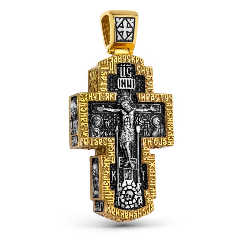На лицевой стороне креста представлен образ Распятия Спасителя. По сторонам от Христа стоят Богородица и Иоанн Креститель, передающие тишину и сосредоточенность великой Голгофской сцены.
