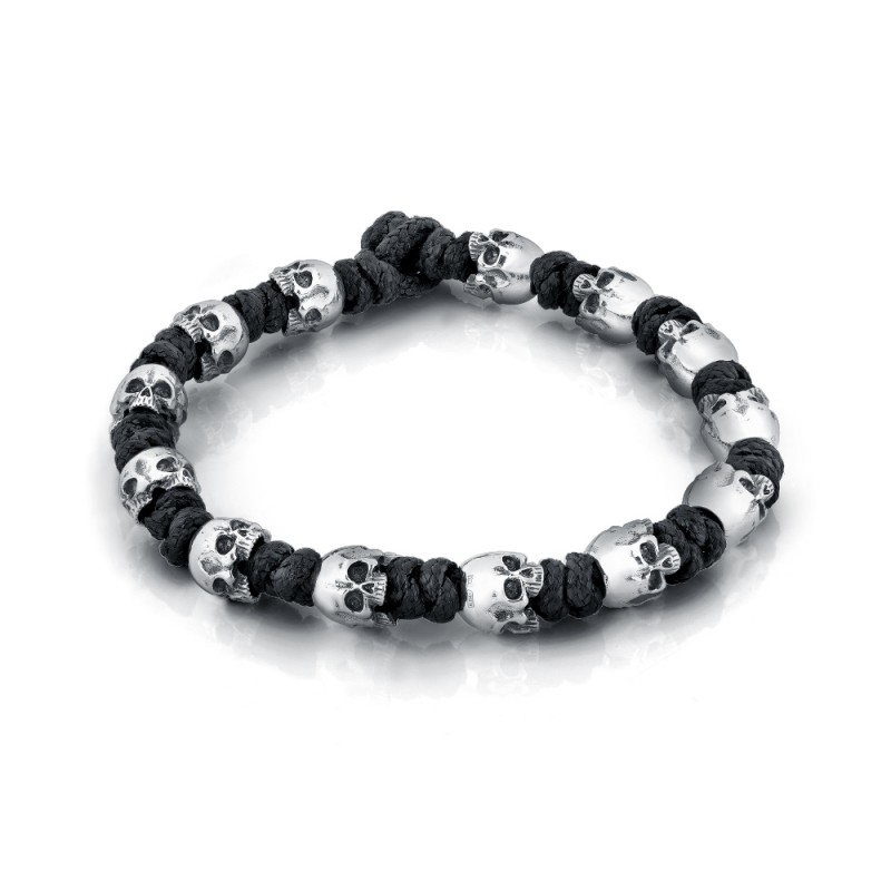 Этот браслет сочетает прочный гипоаллергенный текстиль, который можно не снимать во время купания и банных процедур, с серебряными бусинами в форме черепа.