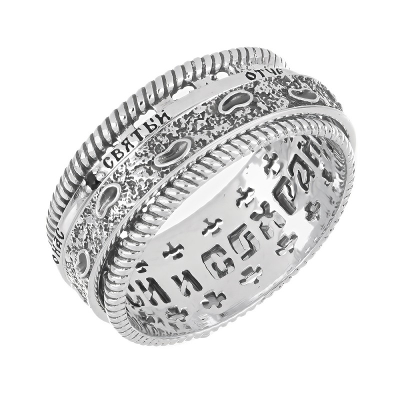 Почитая Святителя Спиридона и вдохновившись его чудесами, художники спроектировали необычное кольцо: на одной вращающейся части - молитва святому Спиридону, на другой - стилизованные следы Святителя, как напоминание, что он ходит по земле и помогает верующим по воле Господа, кто просит его.