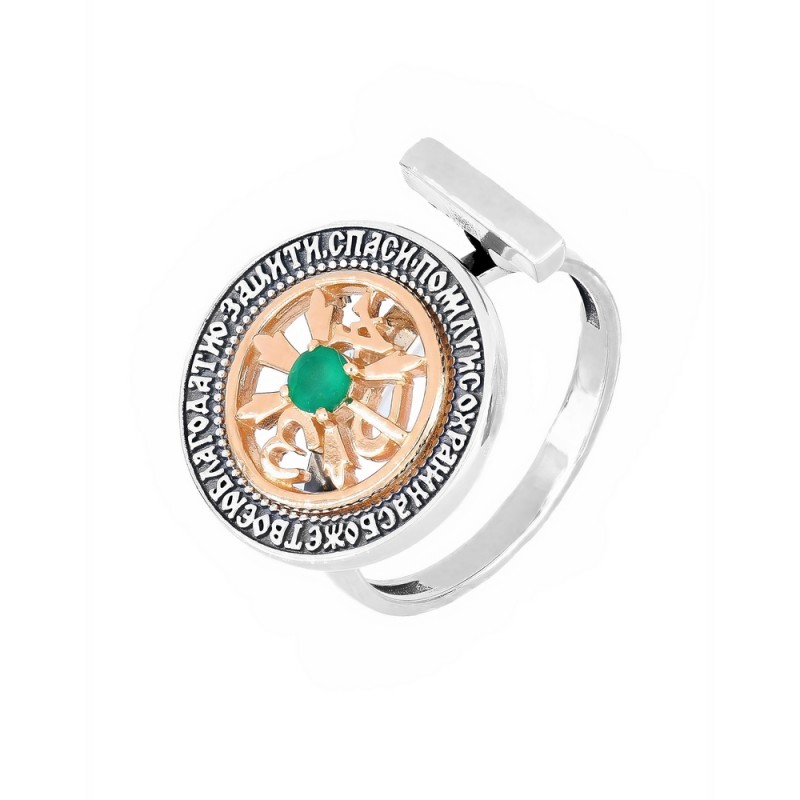 Кольцо Хризма "Защити, спаси и п..." с зеленым агатом из серебра 925 пробы с позолотой 585, 2 мм (арт. 286057)