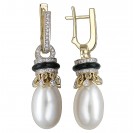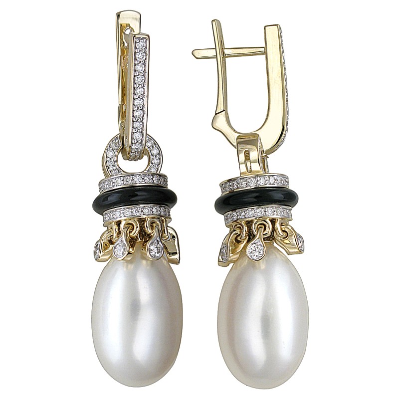 Серьги с агатом, жемчугом и бриллиантом из желтого золота 585 пробы (арт. 271697)