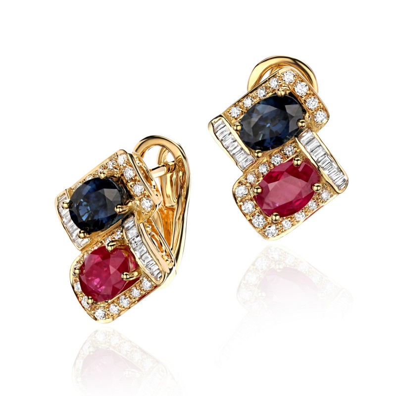 Серьги с бриллиантом, сапфиром и рубином из желтого золота 750 пробы можно купить в нашем интернет-магазине с доставкой по Москве, а также транспортными компаниями по всем городам России.